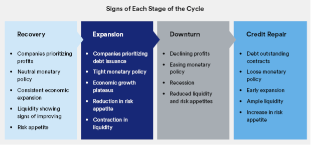2) Downturn: Economy typically falls into recession, the credit cycle tips into a downturn, corporate profits fall, credit conditions tighten, credit spreads widen, risk appetite and liquidity declines, monetary policy easing and fiscal stimulus ensues.