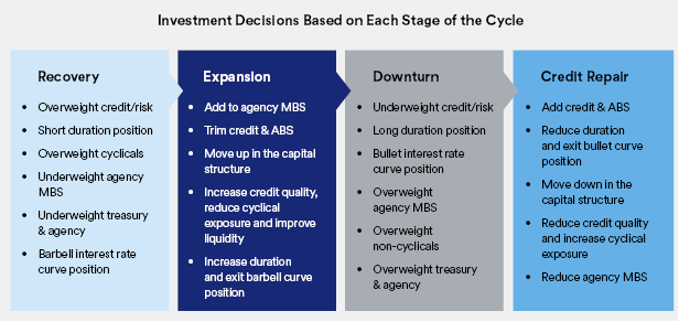 Our investment philosophy for managing core bond portfolios is based on a set of principles that seek to form a consistent, repeatable framework for investment decision-making. We believe strong and consistent performance over a full market cycle is rooted in our ability to position portfolios and manage risk throughout each stage of the business and economic cycle. The goal is to anticipate and reposition portfolios ahead of major inflection points between stages of the cycle, periods which tend to drive larger market moves.