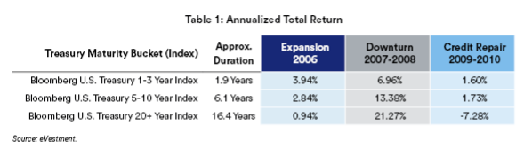 As shown in Table 1, the largest annualized total returns amongst short, intermediate, and long duration U.S. Treasury indices during the downturn phase (2007 and 2008) occurred in the longer duration indices (i.e. those with more sensitivity to changes in interest rates). Conversely, during the latter part of the expansion phase interest rates are typically rising as growth and inflation may be overheating and the Fed is likely to be raising rates. In this case, shorter duration (less interest rate sensitive) fixed income strategies tend to outperform longer duration strategies as shown during the end of the expansion phase (2006).