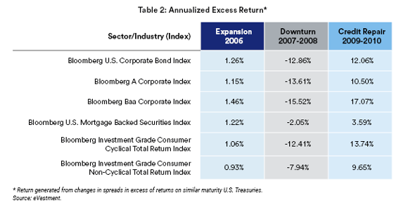 Table 2 shows that the annualized excess return (return generated from changes in spreads in excess of returns on similar maturity U.S. Treasuries) of the U.S. Corporate Bond Index exceeded that of the Mortgage-Backed Securities Index during the credit repair phase (2009 and 2010) and vice versa during the downturn phase (2007 and 2008). Additionally, the lower credit quality index (Baa Corporate Index) and consumer cyclical index (Investment Grade Consumer Cyclical Index) generated a higher excess return than the higher credit quality index (A-rated Corporate Index) and consumer non-cyclical index (Investment Grade Consumer Non-Cyclical Index) during the credit repair phase (2009 and 2010).